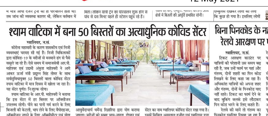 Modern Group has started a 50-oxygen-bed FREE quarantine center for COVID patients at its facility at Shyam Vatika, Gwalior, Madhya Pradesh. The facility "Gwalior COVID Center" has beds equipped with medical grade oxygen concentrators, mobile charging points, hot water kettle, vaporizer, etc. The center provides complete medical care, balanced diet meals, medicines, yoga training and kadha to the patients without taking any amount. There is no fees/cash counter. The center also broadcasts spiritual and religious videos for patients to help the patients recover psychologically.